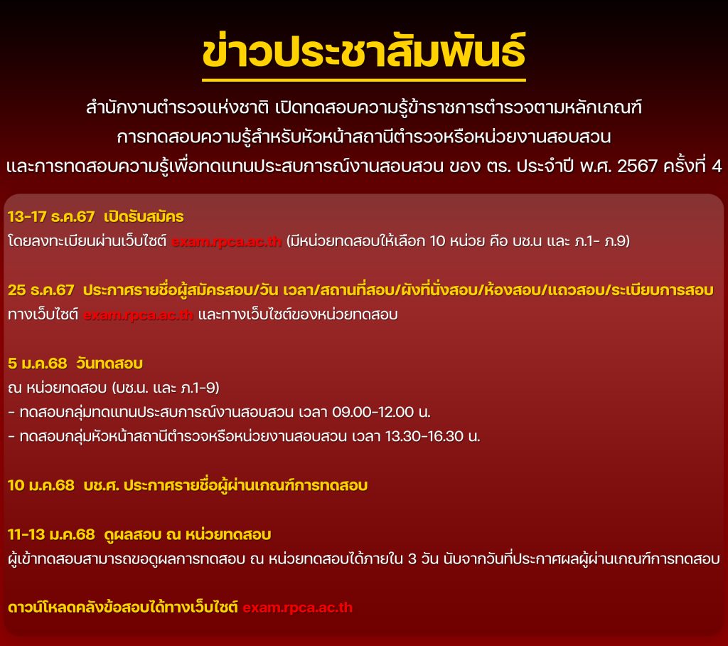 การทดสอบความรู้ข้าราชการตำรวจสำหรับหัวหน้าสถานีตำรวจหรือหน่วยงานสอบสวน และการทดสอบความรู้เพื่อทดแทนประสบการณ์งานสอบสวน ของ ตร. ประจำปี 2567 ครั้งที่ 4