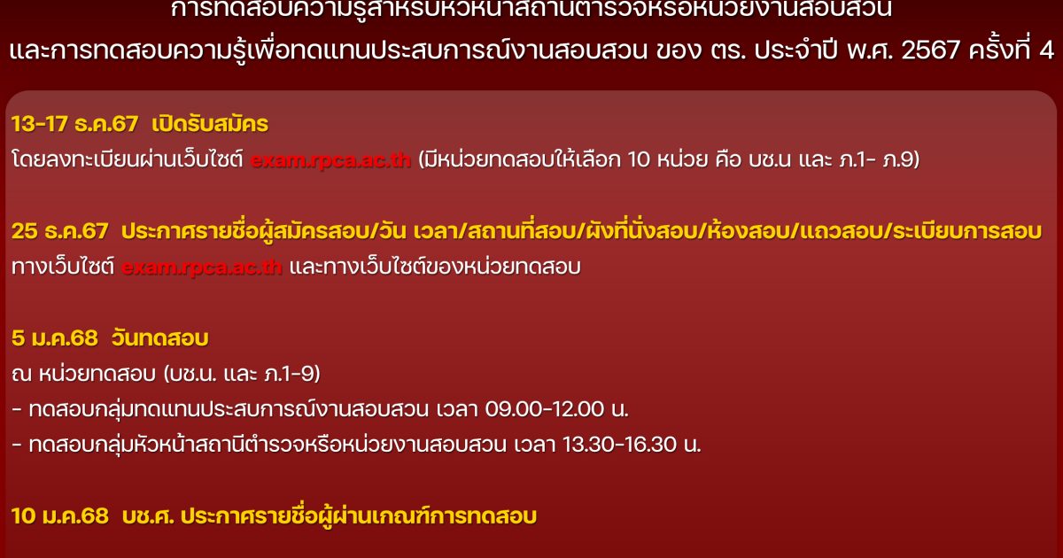 การทดสอบความรู้ข้าราชการตำรวจสำหรับหัวหน้าสถานีตำรวจหรือหน่วยงานสอบสวน และการทดสอบความรู้เพื่อทดแทนประสบการณ์งานสอบสวน ของ ตร. ประจำปี 2567 ครั้งที่ 4