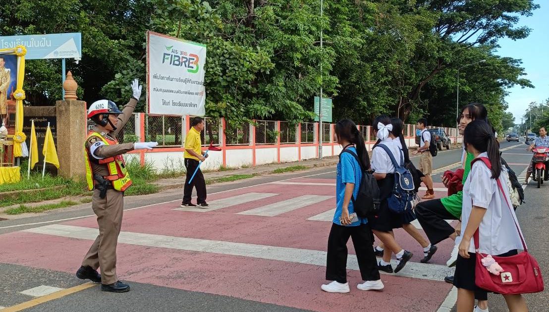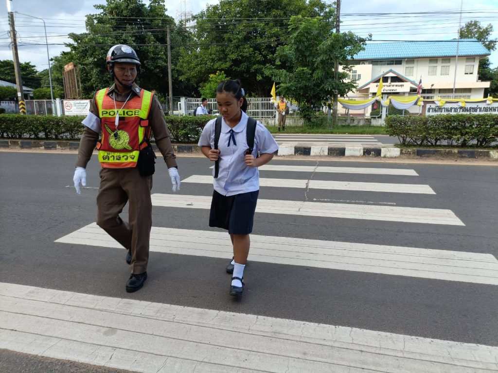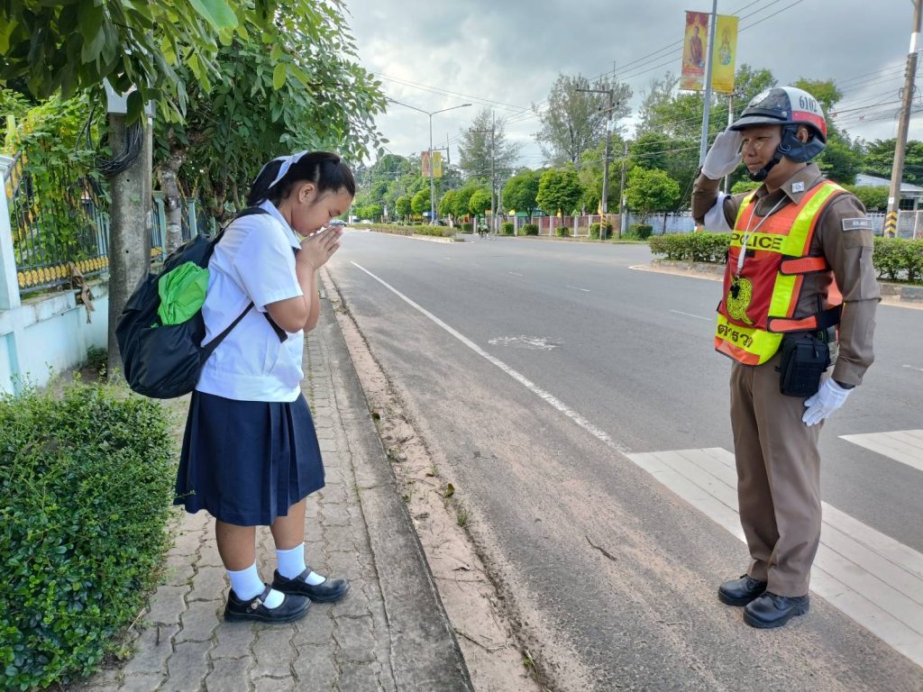 ด.ต.จักรีพิริยะกุล เบิกบาน ผบ.หมู่(ป.)สภ.พนา ปฏิบัติหน้าที่ธุรการจราจร อำนวยความสะดวกการจราจร บริเวณหน้าสถานศึกษา