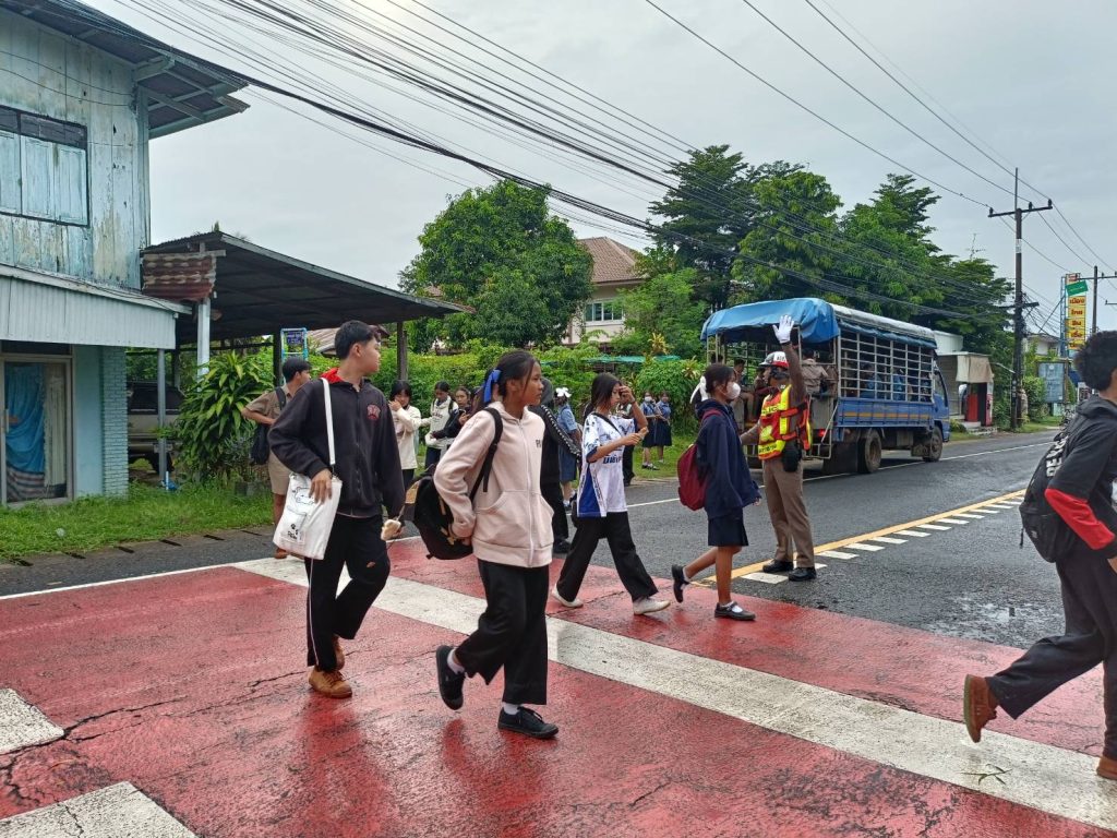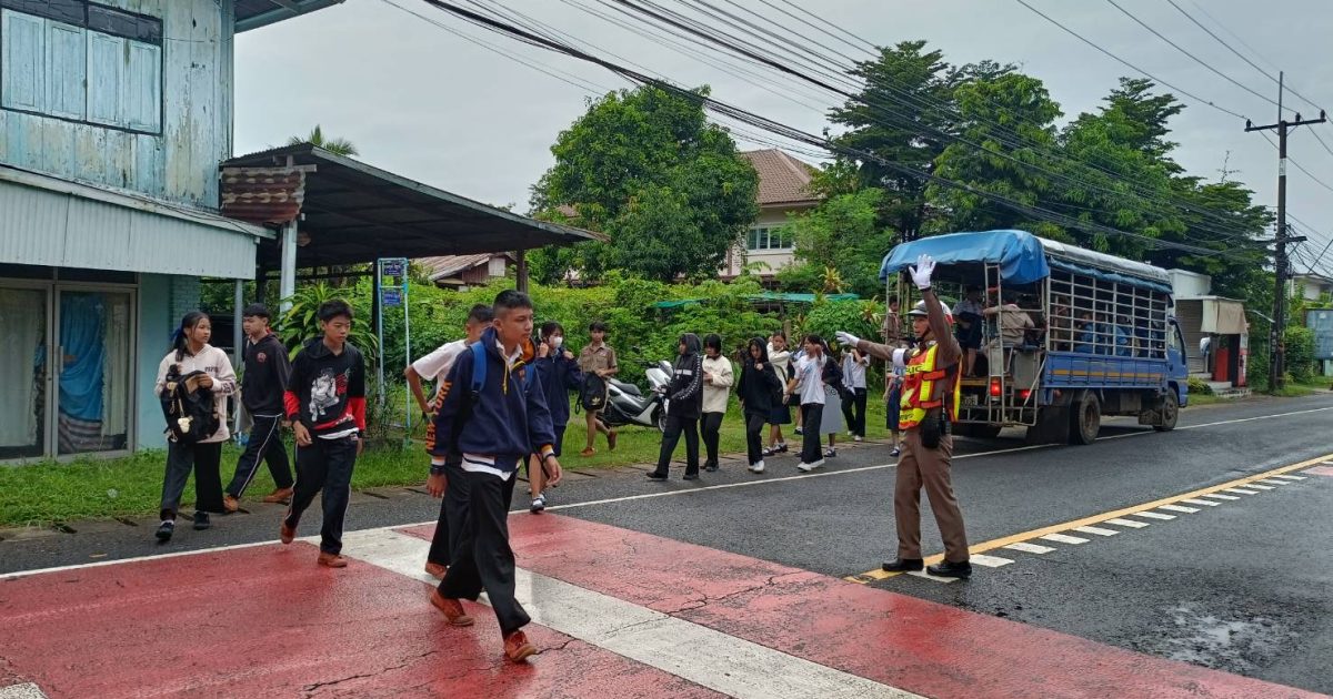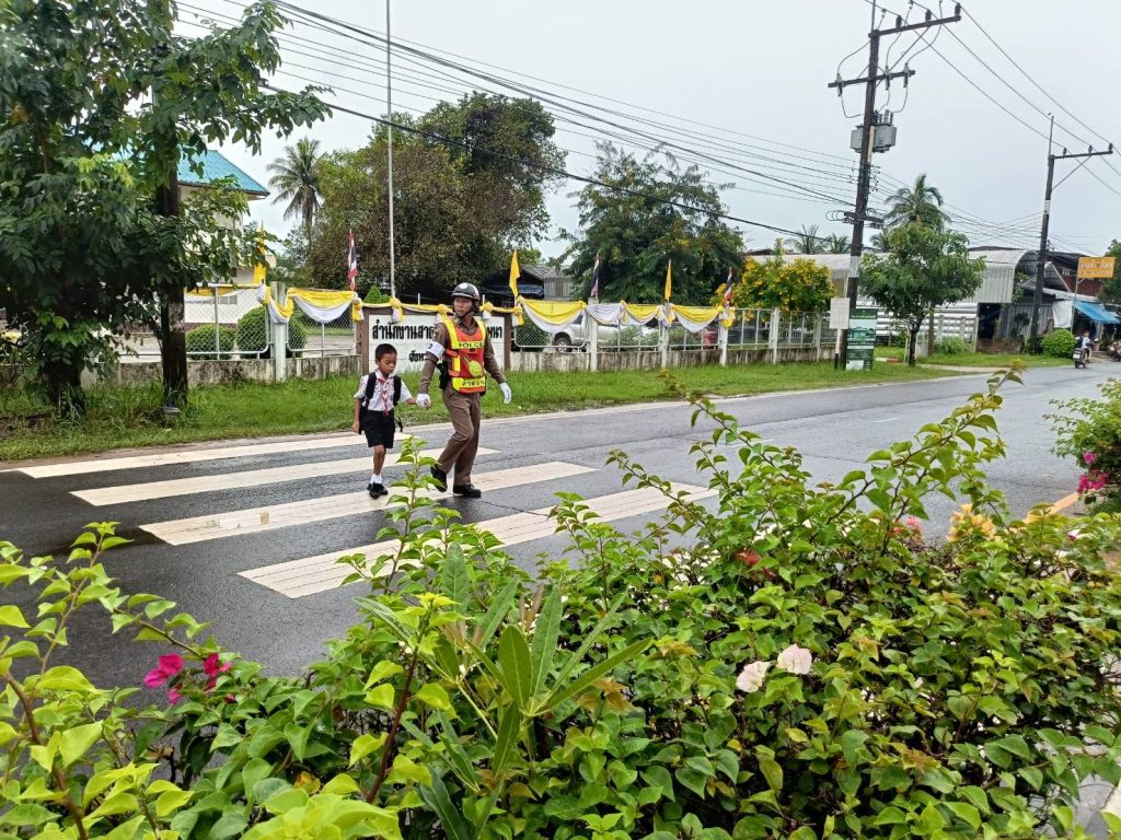 ด.ต.จักรีพิริยะกุล เบิกบาน ผบ.หมู่(ป.)สภ.พนา ปฏิบัติหน้าที่ธุรการจราจร อำนวยความสะดวกการจราจร บริเวณหน้าสถานศึกษา